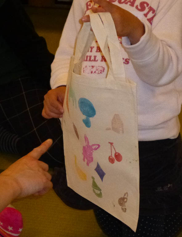 そんな中、2階の小さな畳の和室でスタンプを使ったエコバッグ作りを行いました。