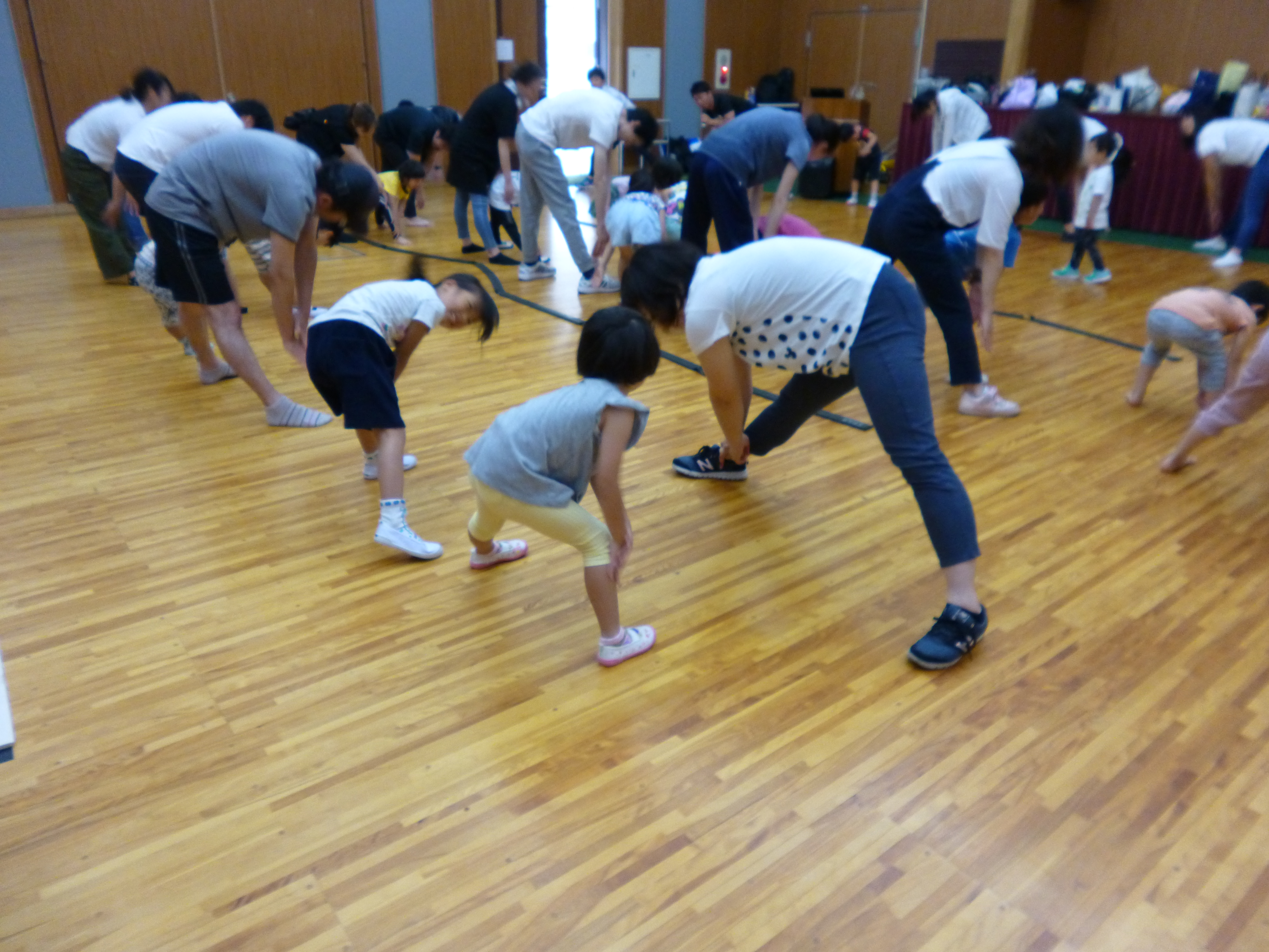 まずはストレッチから。お母さんをまねて上手に出来ています!