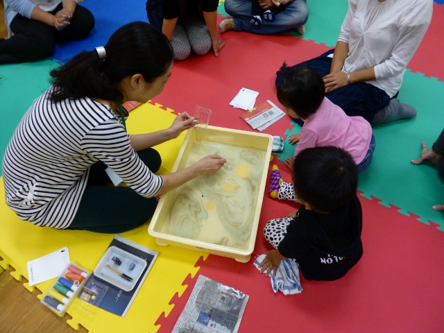 お水に墨汁やインクを流して、ハガキに写し取って遊びました。どんどん広がる模様。とっても不思議です。はじめは少し緊張気味の子どもたちも、時間が過ぎていくと、自分たちでインクを流してみたり、お水からハガキを救い出してくれたり、どんどん興味が出てきたようです。