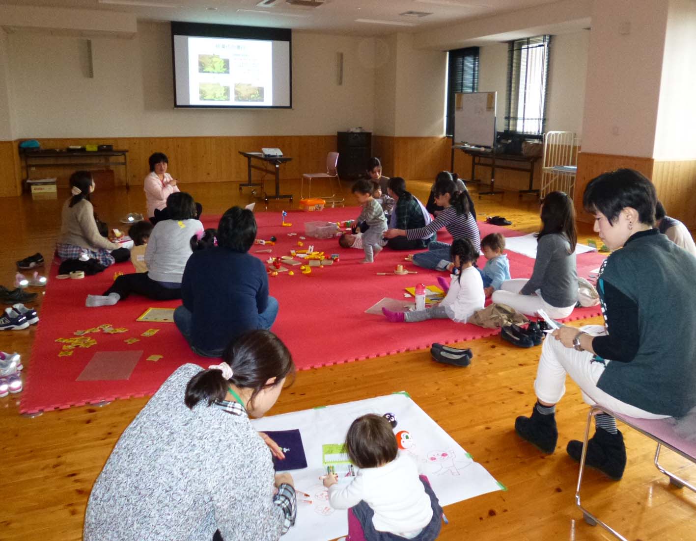 子どもたちは、マットの上で、パズルをしたり、積み木で遊んだり、大きな紙にクレヨンで絵を描いたりして遊びました。
