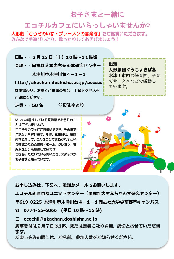 今年度最終回のエコチルカフェは人形劇「どうぞのいす・ブレーメンの音楽隊」です。