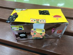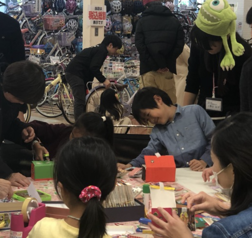 後半の工作教室、牛乳パックで作るびっくりばこは、お母さん、お父さん、スタッフと一緒に、みんな真剣そのものでがんばってくれて、飾り付けをしたら出来上がり。