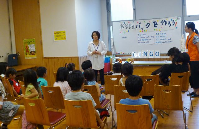 英語を使うと長くなる名前も、最後まで諦めずにスタンプを押したり、裏表で英日を切り替えたり、柄を上手に工夫したり、とても素敵なバッグができあがりました。最後に自分の作ったバッグを見せあいっこすると、歓声が上がったり拍手をしたり、みんな思わず笑顔がこぼれました。